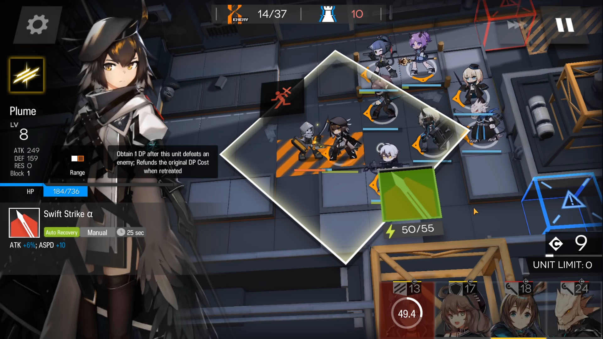 Во время боя игрок управляет ресурсом, необходимым для вызова операторов на поле. Персонажи размещаются на заранее обозначенных клетках, после чего начинают автоматически выполнять свои задачи. Важной частью механики является своевременное использование активных умений, которые могут кардинально изменить ход сражения.